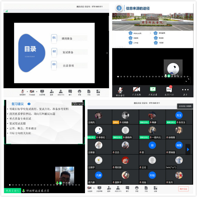 今年的考研复试因疫情增添了很多不确定性因素,此次“云分享”考研复试经验交流会中五名优秀毕业生的倾囊相授,让考研学生更好的地了解到考研复试流程、调剂技巧,极大地增强了考研学生复试的信心。数学学院始终秉持“为学生提供更好服务”的宗旨,努力帮助考研学生提升自身综合能力,最终实现高质量满意就业。