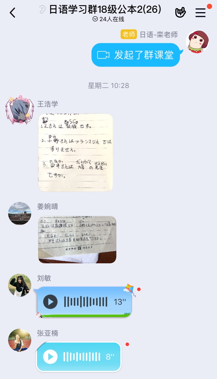 日语教师栾佳将“智慧树”平台与“QQ群课堂”进行了完美的结合,进行了深受学生喜爱的线上直播。此外,栾佳老师还充分利用腾讯软件的“群相册”功能,要求学生将自己的作业拍照发至“群相册”,使本班同学互评互助,共同进步。