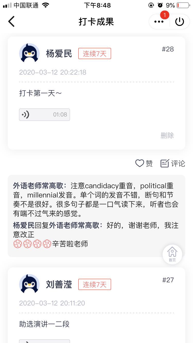 (图为常高歌老师分享学生“跟读”打卡任务)